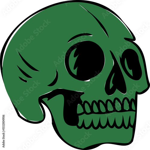 Fototapeta premium Green skull is floating in flat illustration facing right, hollow sockets on transparent background