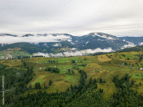 Naklejka premium Green slopes of Ukrainian Carpathian mountains in summer. Cloudy morning, low clouds. Aerial drone view.