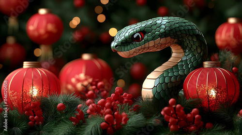 © Siasart, Fototapeta premium Green Snake Amidst Festive Red Ornaments