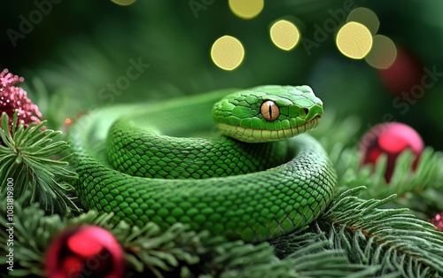 © Marina, Fototapeta premium green snake christmas background