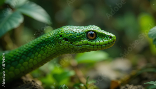 © Firman, Fototapeta premium Green Snake Close-up Head Shot in Natural Outdoor Environment
