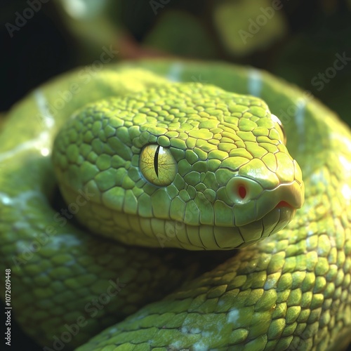 © Khrystyna Turchyn, Fototapeta premium Green Snake Coiled in Tropical Habitat
