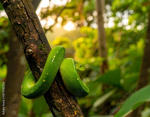 © Gek, Naklejka premium Green snake coiled on a tree branch in a lush forest