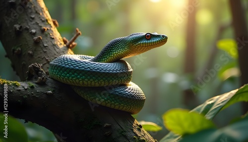 Fototapeta premium Green snake coiled on a tree branch under sunlight with blurred forest...