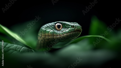 Fototapeta premium Green snake crawling through lush grass in a shaded natural environment