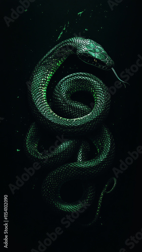 © Anna, Fototapeta premium Green snake on a dark background, wallpaper