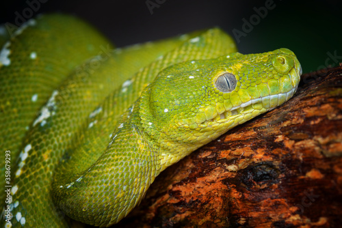 © Dwi, Fototapeta premium Green snake on branch in tropical garden