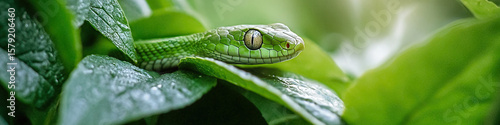 Obraz premium Green Snake on Green Leaves