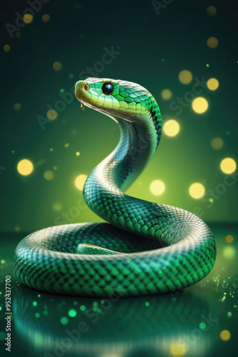 © El_design, Fototapeta premium Green snake on the background of the lights with a bokeh effect for the design of cards and invitations for the Christmas holidays.