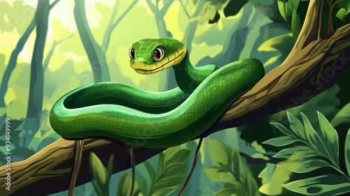 © ArtLerie, Fototapeta premium Green snake on tree branch in tropical forest. Cute reptile rest. Chinese new year symbol. Illustration of exotic flora and fauna, dangerous cartoon animal character