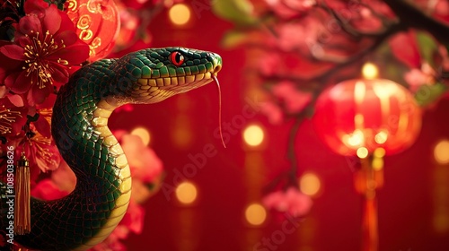 © El Media, Fototapeta premium Green snake, red background, lanterns and flowers, Chinese New Year concept.