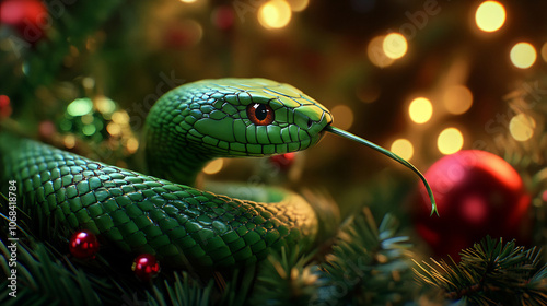 Obraz premium Green snake resting among Christmas decorations