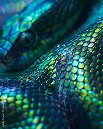 © Ardhana, Obraz premium Green Snake Scales Iridescent Texture Close Up
