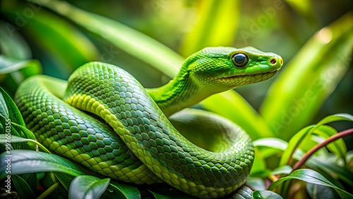 © Selene Studio, Fototapeta premium Green snake slithering through lush garden, green, snake, garden, nature, reptile, wildlife, serpentine, foliage