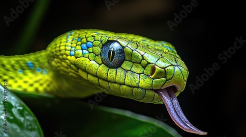 © Julia, Fototapeta premium Green Snake with Blue Spots Gracefully Resting, Flicking Tongue in Natural Light