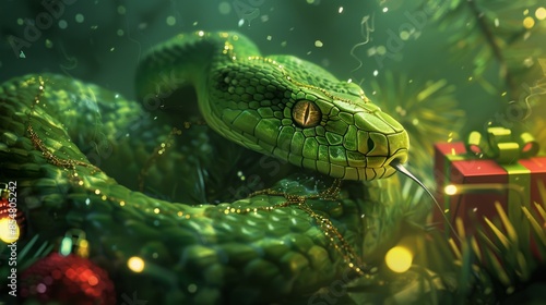 © studio clever, Fototapeta premium Green Snake with Christmas Decorations, Generative AI