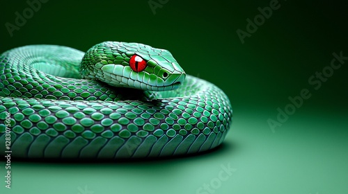 Obraz premium Green snake with striking red eyes coiled on emerald backdrop. Ideal for New...