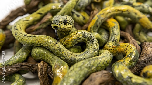 Obraz premium Green snakes tangled in branches, art installation, studio