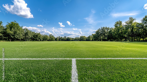 Obraz premium Green soccer field horizon with white line and trees under bright blue sky