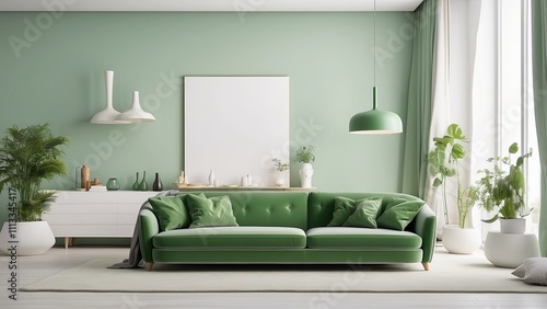 © Umri, Fototapeta premium Green sofa and bedroom in a white living room-