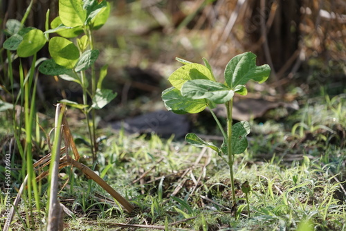 © Kingsakai, Fototapeta premium Green soybeans are growing on the ground covered with rice straw.