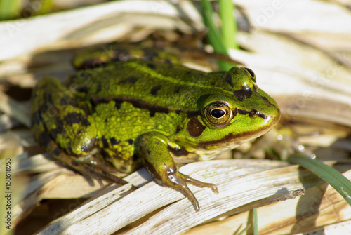 © Veresovich, Naklejka premium Green spotted frog sits on dry sedge leaves. Shallow depth of field. Selective focus.