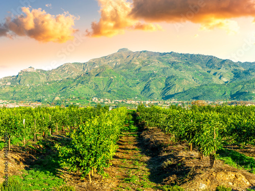 © Yaroslav, Naklejka premium green spring garden landscape with beautiful mountaind and clouds on background. Agricultural landscape of spring or summer fruit farm in outdoor during sunset or sunrise.