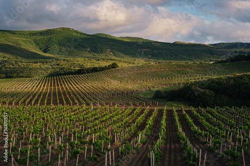 © Seleznov_Molchanova, Fototapeta premium green spring vine yards landscape in cloudy weather