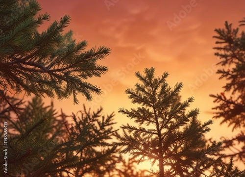 Obraz premium Green spruce branches against a vibrant red-orange sunset backdrop with soft...