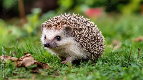 Fototapeta premium Green suburban yard with a hedgehog slowly walking through the grass, tiny paws visible.