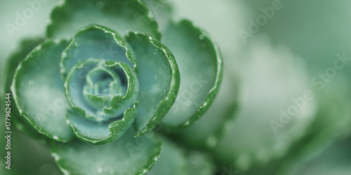 © yrabota, Obraz premium Green succulent evergreen plants close up as natural banner. Beautiful nature abstract cactus as minimal monochrome natural textured pattern, scenic view growth, botanical background ith copy space.