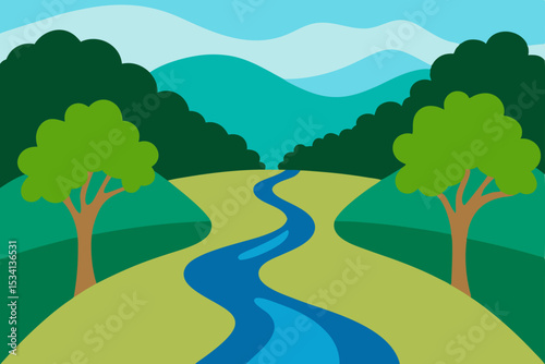 Fototapeta premium Green summer landscape with trees, a winding road, and a blue sky with clouds over hills