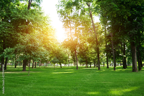 © Kryuchka Yaroslav, Naklejka premium Green summer park at sunny day. Green fresh grass in park.