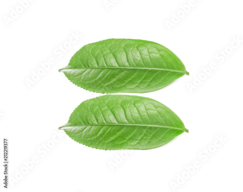 © sangsiripech, Fototapeta premium green tea leaf isolated on white