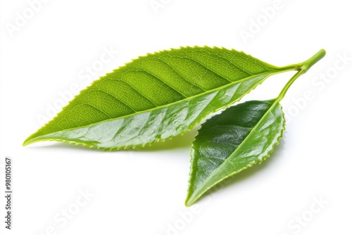 © Dzikrul Husnani, Obraz premium Green tea leaf isolated on white background, ai