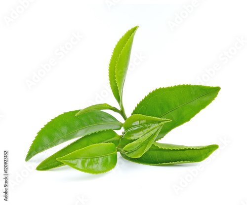 © anatchant, Obraz premium Green tea leaf on white background