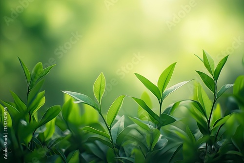 © Enen, Fototapeta premium Green Tea Leaves Growing Background with Soft Focus Spring Light