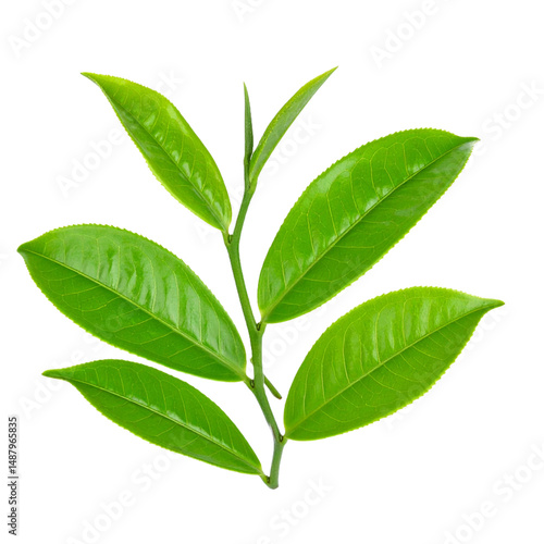 Fototapeta premium Green tea leaves on a white background for refreshing beverage concepts,...