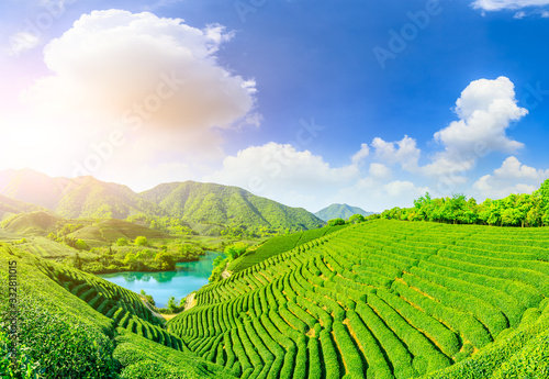 © ABCDstock, Fototapeta premium Green tea mountain at sunset,tea plantation background.