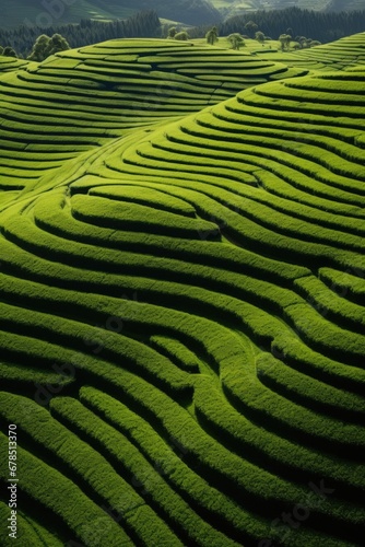 © dark_blade, Fototapeta premium Green tea plantation at sunrise time,nature background. AI Generated