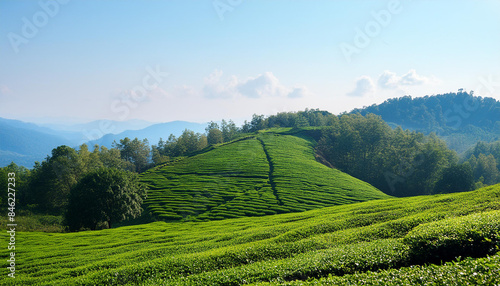 © Shuvro, Fototapeta premium Green tea plantation at sunrise time, nature background. tea plantations landscape in Rize province. tea plantation in early morning, green lines of the tea farm in the morning. Generative Ai