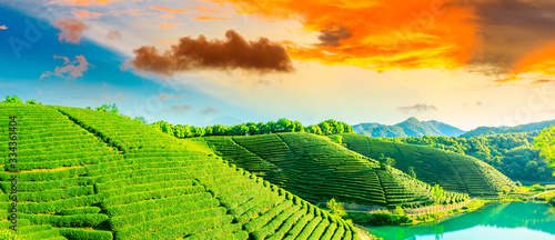 © ABCDstock, Fototapeta premium Green tea plantation at sunset time,nature background.