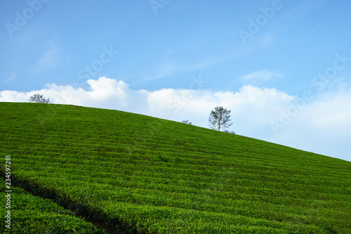 Fototapeta premium Green tea plantation hills with blue sky on background