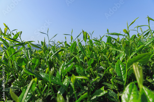 © lzf, Fototapeta premium Green tea shoots grow in spring mountains