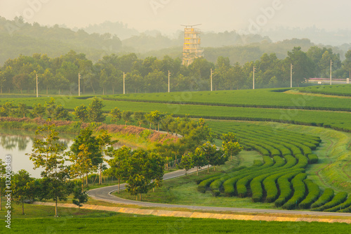 Naklejka premium Green tea terraces field in the morning, Chiang Rai, Thailand