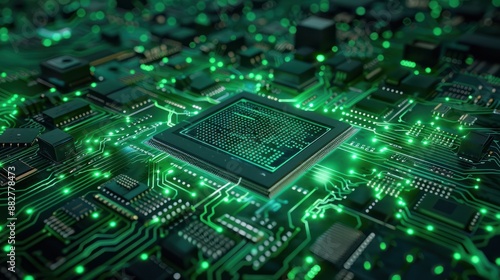 Fototapeta premium Green technology background CPU central processing unit on circuit board, AI...