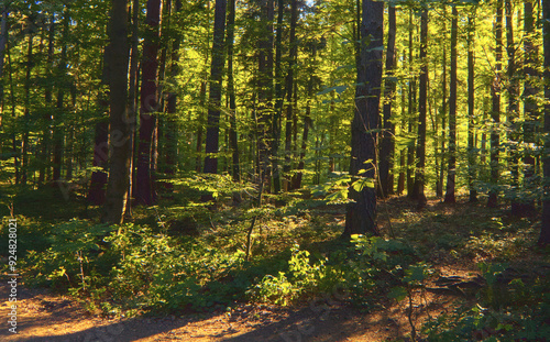 © Darya, Fototapeta premium Green temperate wild forest in summer in sunlight, green grass and trees as illustration of love to nature and calmness and relaxation, quiet place, walking outdoors