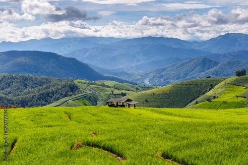 Fototapeta premium Green Terraced Rice Field in Pa Pong Pieng , Mae Chaem, Chiang Mai, Thailand