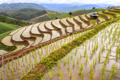 Fototapeta premium Green Terraced Rice Field in Pa Pong Pieng , Mae Chaem, Chiang Mai, Thailand