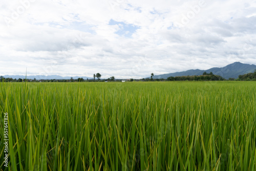 © Charlie's, Fototapeta premium Green Terraced Rice Field. rice is growing in the field background